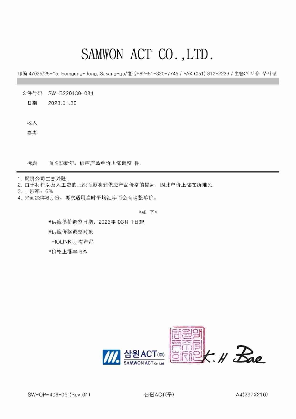 主要内容:由于材料以及人工费的上海而影响到供应价格的提高,自2023年3月1日起,IOLINK所有产品价格上涨6%。