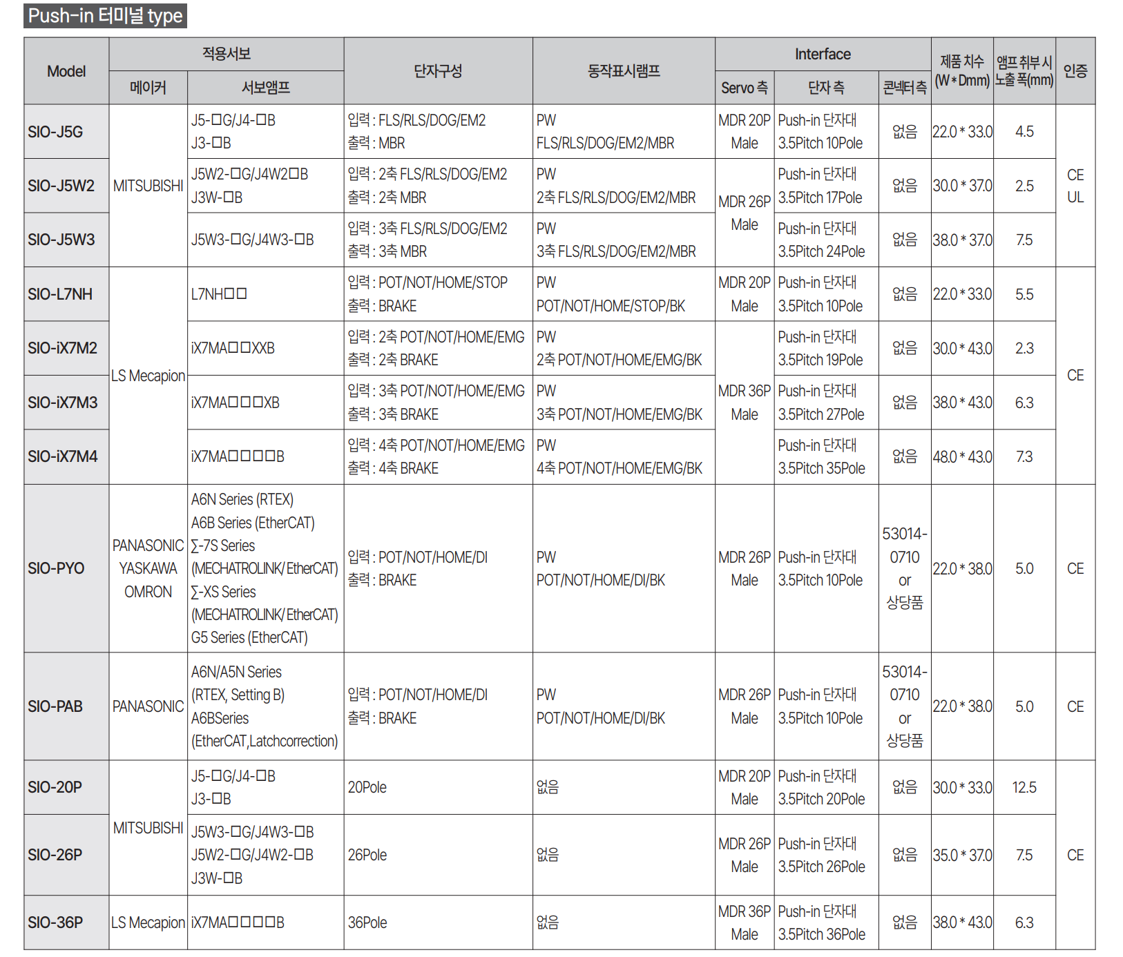 - Push-in终端(SIO-J5G、SIO-J5W2 、SIO-J5W3 、SIO-L7NH、SIO-iX7M2 、SIO-iX7M3 、SIO-iX7M4 、SIO-PYO、SIO-PAB 、SIO-20P、SIO-26P 、SIO-36P)