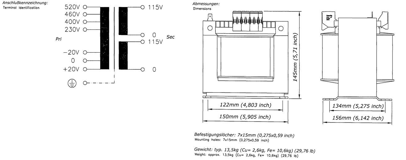 - 1000VA,Input voltage 210/230/250/380/400/420/440/460/480/500/520/540V ac,Output voltage 2x115V ac
