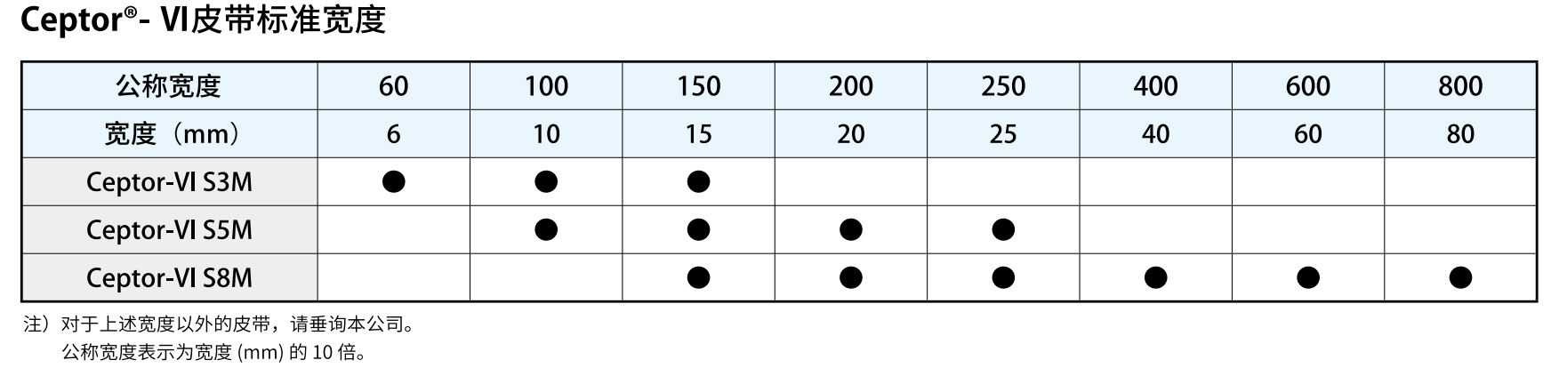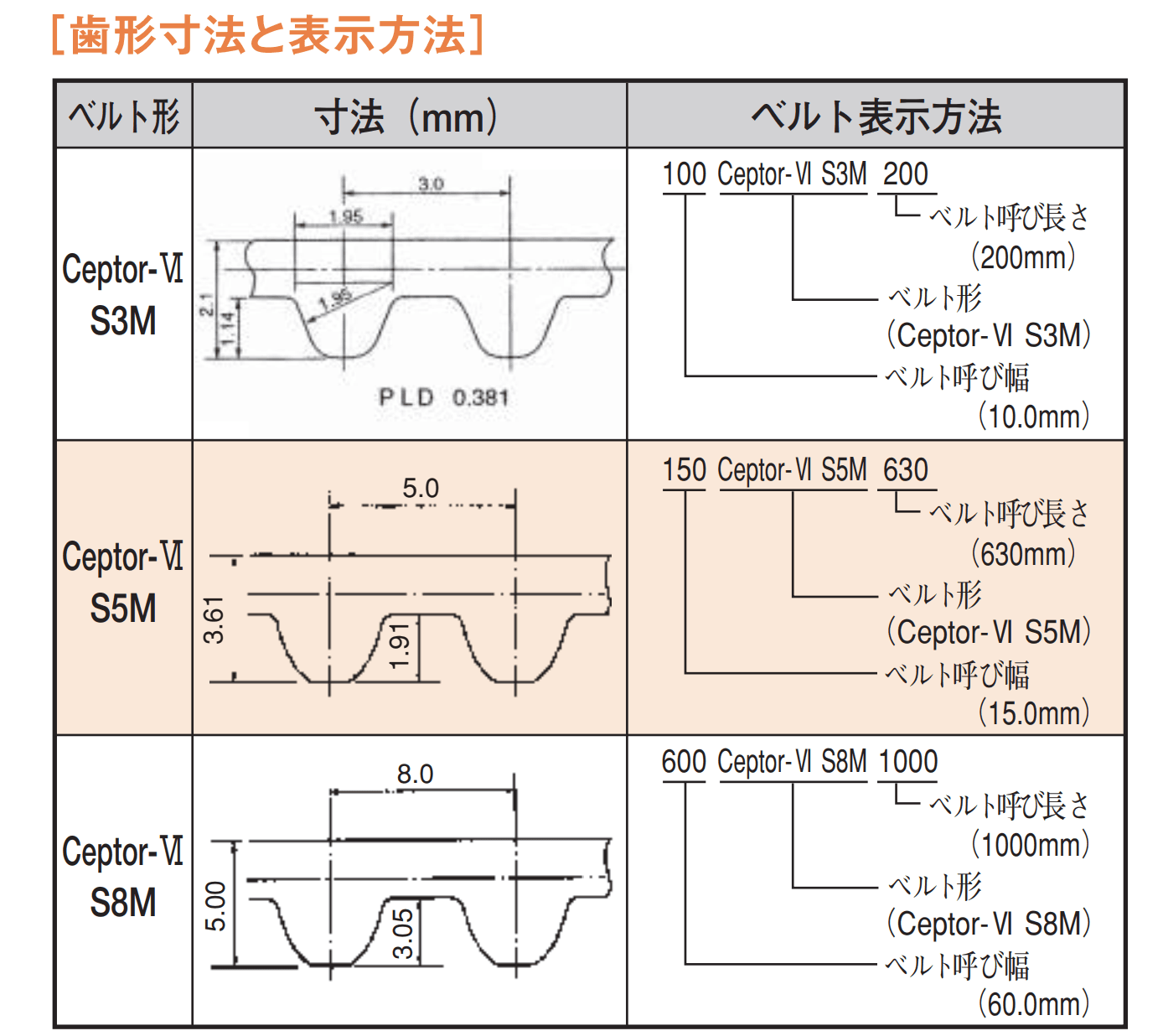| 同步带(Synchronous Belt,シンクロベルト) | S3M、S5M、S8M、S14M | Ceptor-VI系列 |