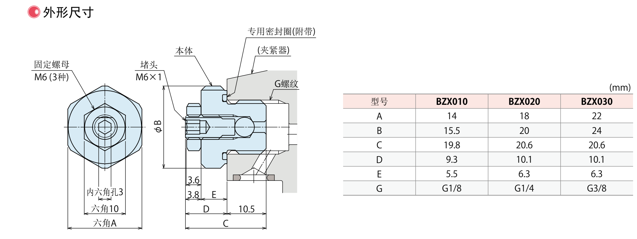 - BZX は、配管方式:Cタイプの油圧クランプ/ ワークサポートに直付け可能なGネジ専用エア抜き弁です。