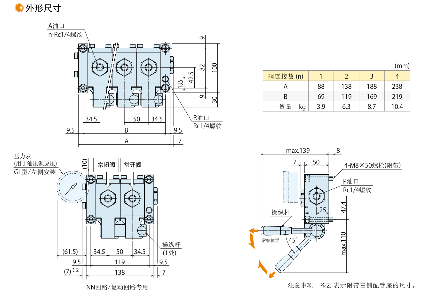 • 通过操作操纵杆控制动作的方向控制阀,即使切断来自油压源的压力供给,仍能保持2次侧油压,直至手动控制操纵杆切换回路。
