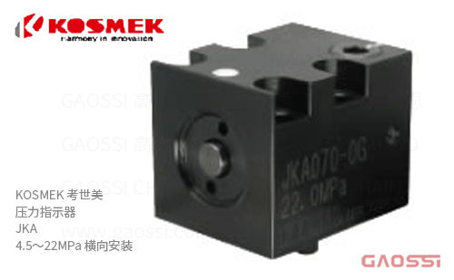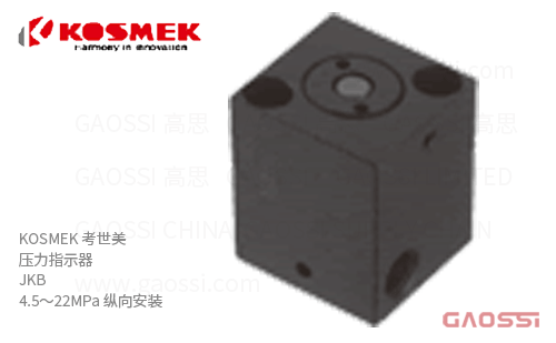 高思(GAOSSI®)专业供应日本考世美(KOSMEK,コスメック)品牌压力指示器(プレッシャインジケータ)JK系列JKA030-0S(5.5MPa)、JKB030-0S(5.5MPa)等产品。通过压力指示器与传感器/开关组合使用,可以检测出与油压源分离的夹具回路的压力,进而实现自动控制时的检测和异常检测。应用在汽车、光伏、机床、冲床/压力机、车辆、钢铁、建筑、机械设备、电气设备、电子、通讯、医疗器械等行业。