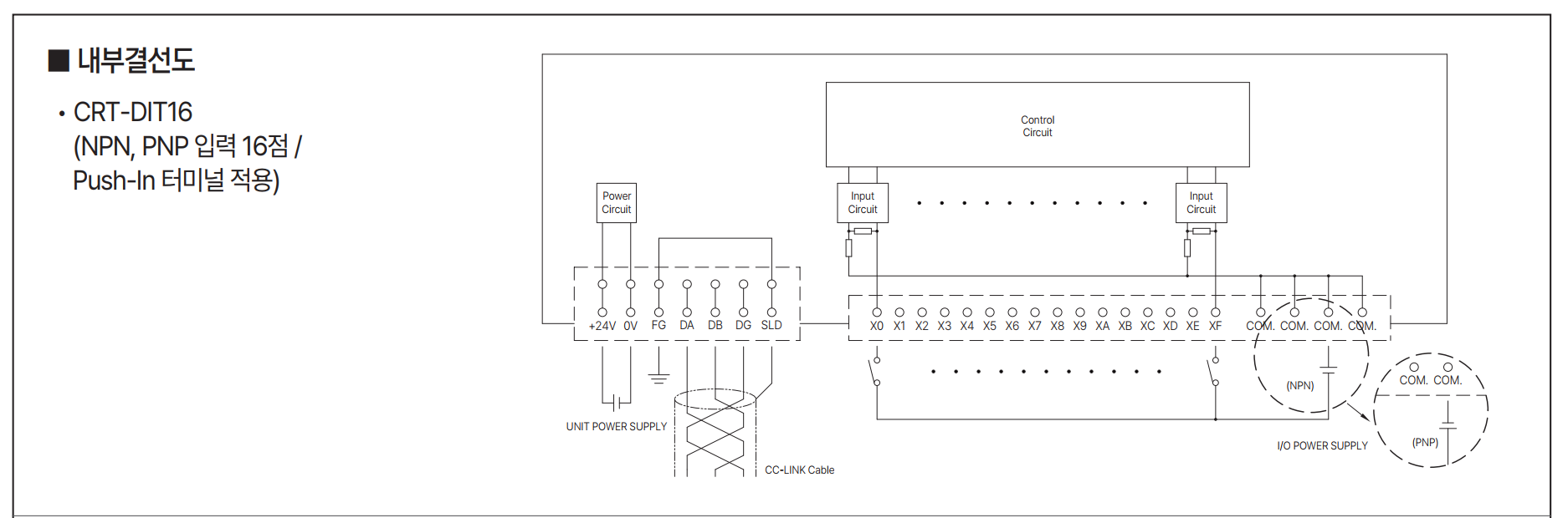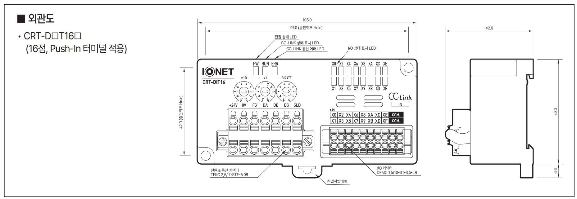 | CRT-DIT16 | 16점 | Input | NPN PNP | 5.08Pitchplugable Push-inspring con./7p,dual | 3.5Pitchplugable Push-inspring con./20p | 105.050.0 | Screw체결/ DINRail (Chanel) |