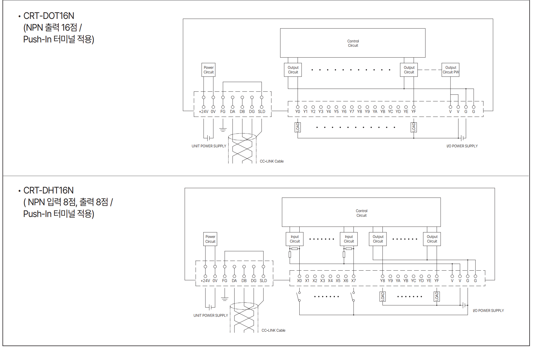 | CRT-DOT16N | 16점 | Output | NPN | 5.08Pitchplugable Push-inspring con./7p,dual | 3.5Pitchplugable Push-inspring con./20p | 105.050.0 | Screw체결/ DINRail (Chanel) |