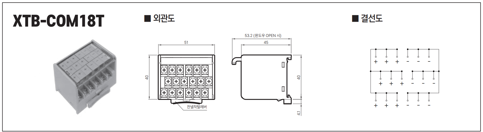 | XTB-COM18T | 18 | 좌측열9P⊕ /우측열9P⊖ Common | 51.040.0 | DINRail (Channel) |