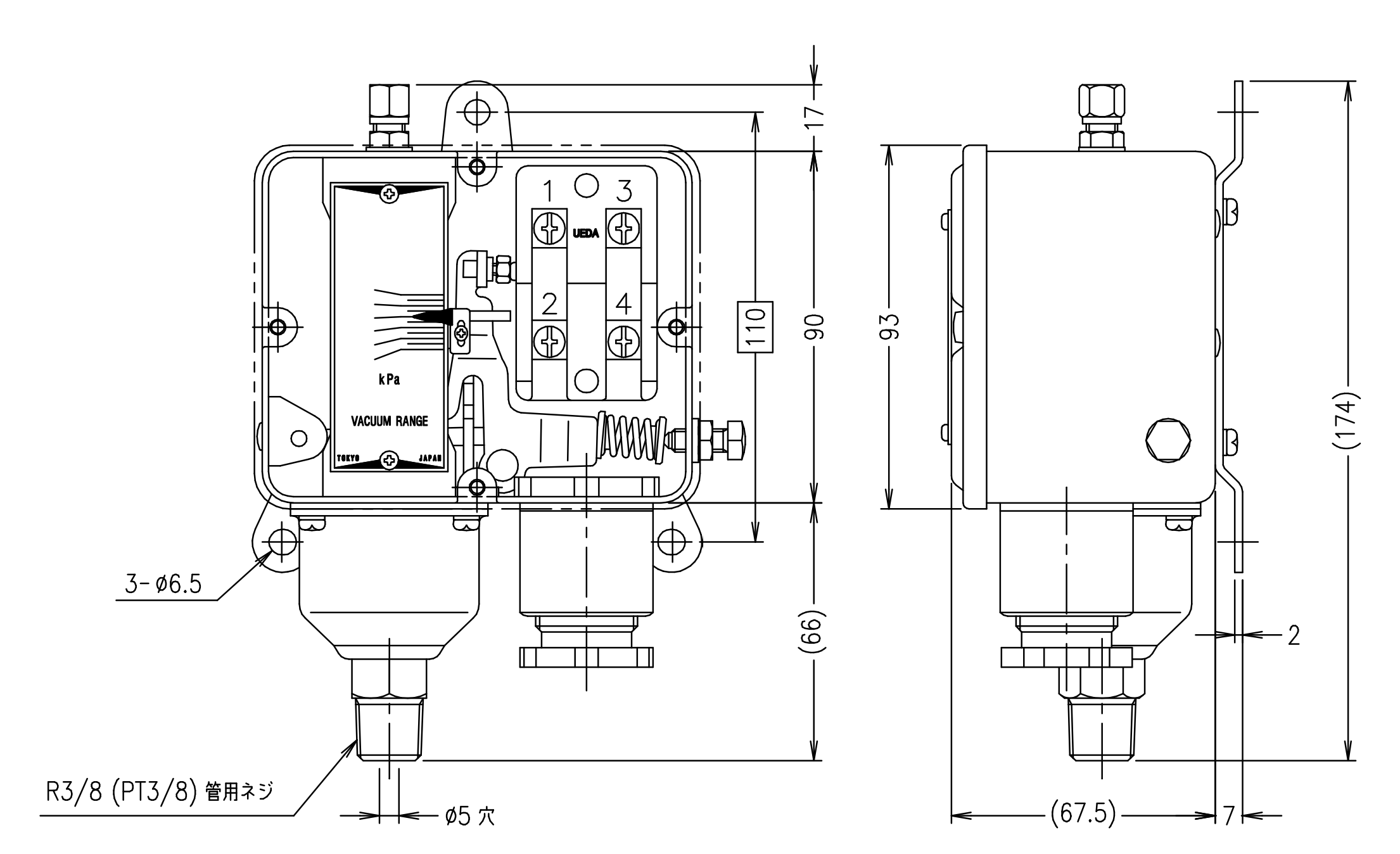 • 作動レバー先端はコイルばねによるクイックアクション機構を持ち、電気的開閉速断機構も鋭敏で、さらにスナップアクションスイッチからなるダブルアクションにより精度と信頼性の高い真空自動制御機器です。また、設定値の再調整もカバーを取らずに外部から調整ができ、設定値が一目でわかる様に目盛板(インジケーター)が付いております。