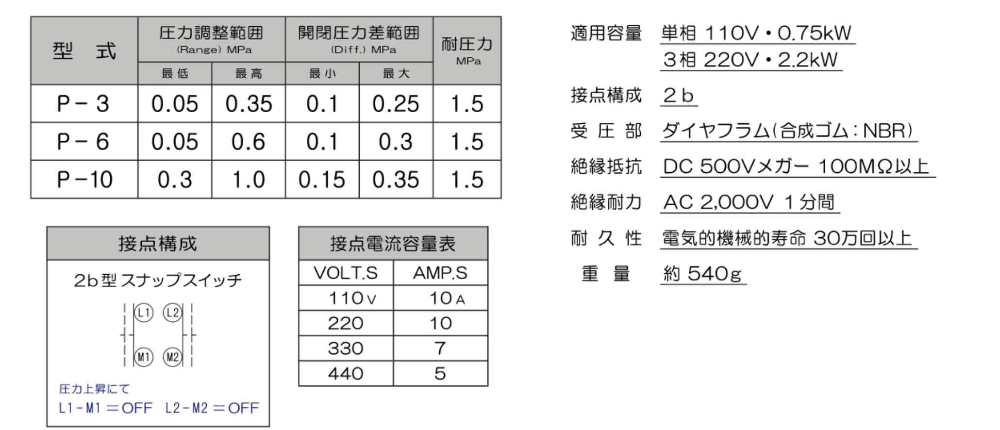 • Pシリーズは、各種ポンプおよびエアーコンプレッサーの自動制御ならびにあらゆる空圧・水圧制御用途に設計した負荷直接制御用の圧力スイッチです。
